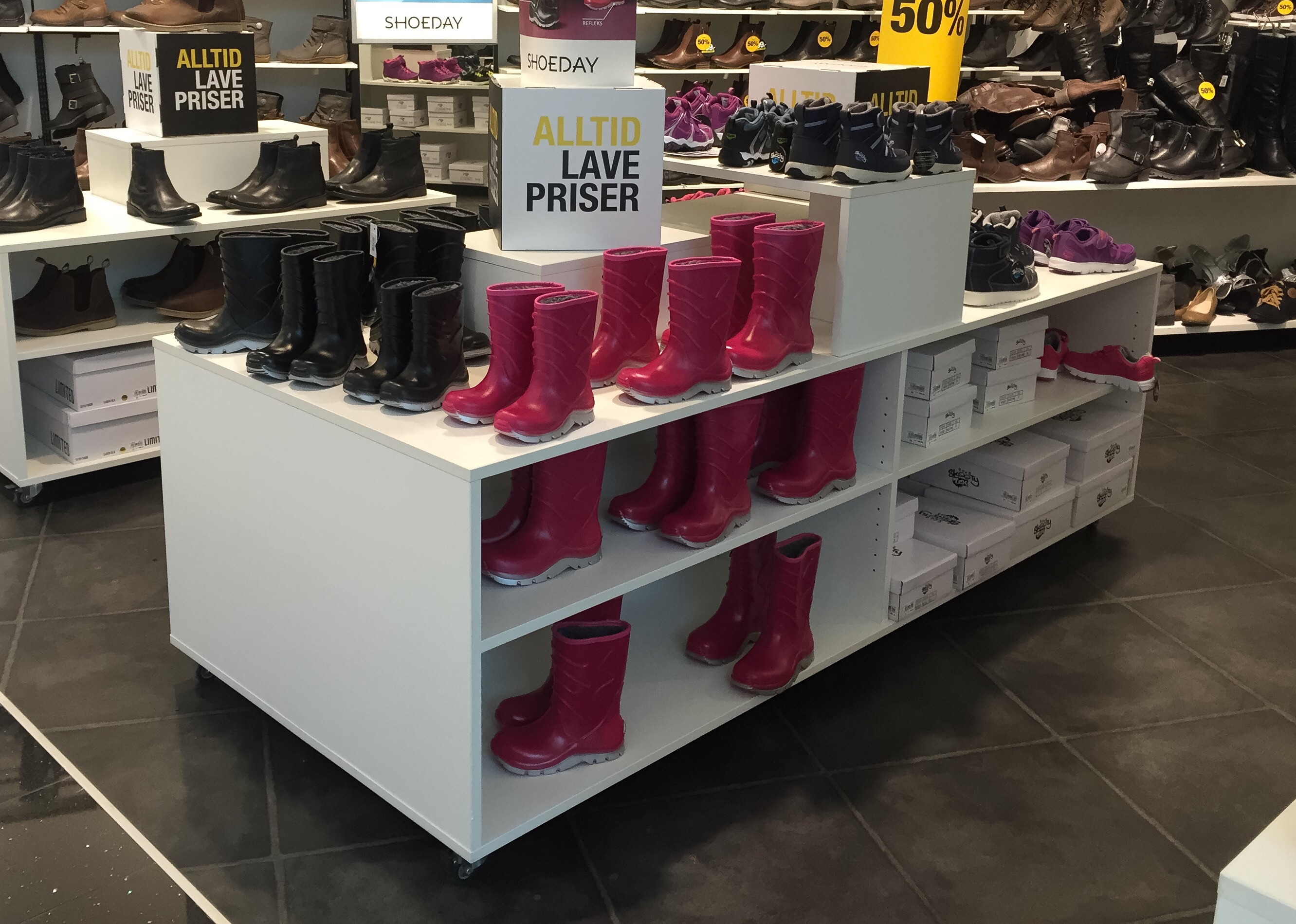 Jeg gikk forbi en av butikkene til en stor skokjede her om dagen. Her er utvalget av barnesko som møtte meg ved inngangen:  Rosa/lilla (men i det minste: farger!) til jentene: svart, mørkt, kjedelig til guttene.