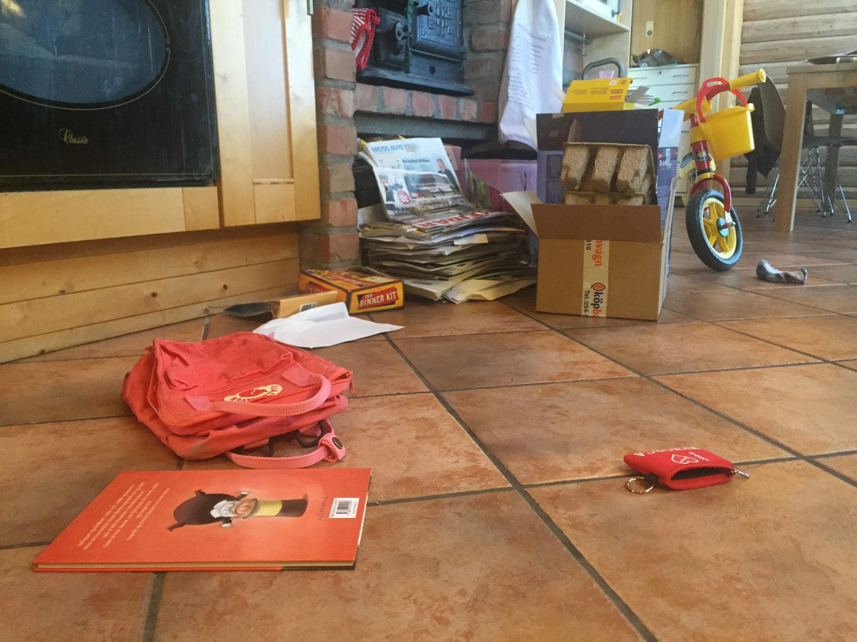 Exhibit A: kjøkkengulv. André Bjerkes Moro-vers, en barnehagesekk, en lommebok (souvenir fra Menorca), en ullsokk og en sykkel med påhengende bøtte med spade. For ikke å snakke om alt papiravfallet som er frekt nok til ikke å finne veien ut til resirkuleringa på egen hånd.