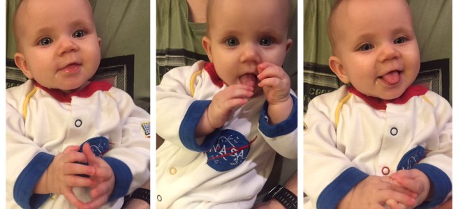 Knappe to døgn tidligere, da Rora ennå bare var en fem måneder gammel baby med forkjølelse, tok vi på henne romdrakt-pysjen som Konrad hadde kjøpt i Orlando. Rora hadde vært så slapp de siste dagene, men nå var hun mer i slag. Vi tullet og kilte og tok noen herlige bilder av den lille astronauten. Og så hørte vi på Space Oddity. Det passet ekstra godt som en slags tribute til David Bowie, som hadde gått bort noen dager tidligere.