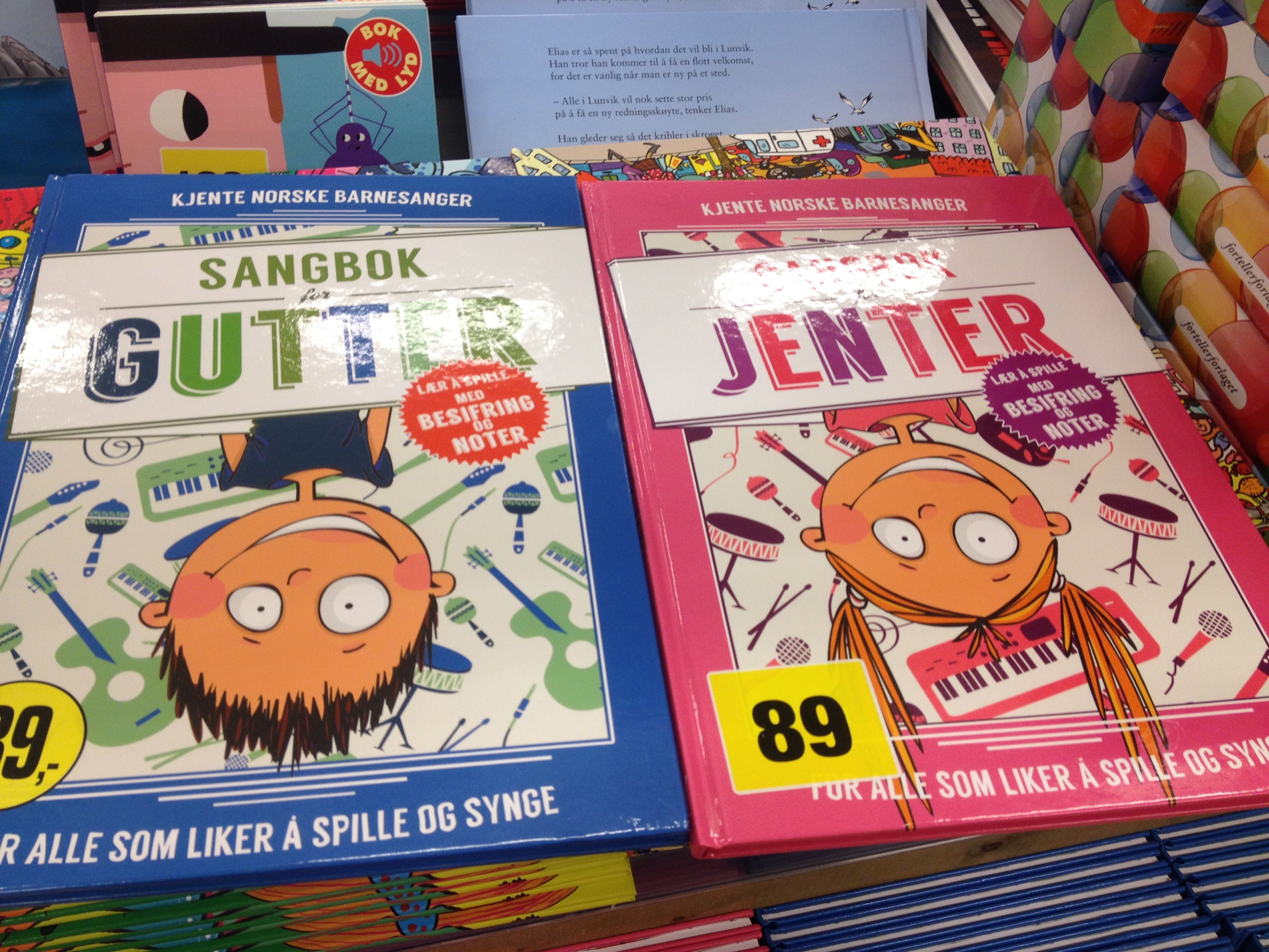 Jeg er redd for at en stadig større andel kjønnede leker fører til større kjønnsforskjeller i yrkesvalg, fritidsaktiviteter osv. Jo flere leker som er tilpasset kjønn, jo mer begrenset blir utvalget. Jeg visste forresten ikke om jeg skulle bryte ut i latter eller bli rasende da jeg oppdaget at et forlag har gitt ut en «Sangbok for jenter» og en «Sangbok for gutter». Gutter og jenter er tydeligvis så forskjellige at de ikke kan synge de samme sangene en gang. Noen sanger fant jeg i begge bøkene, mens der guttene f.eks skulle synge «Nisser og dverge», skulle jentene synge «Sov dukkelise». Stakkars den redaktøren som fikk i oppdrag å velge ut «guttesanger» og «jentesanger»! IMG_3789IMG_3788 Jentene skal altså synge